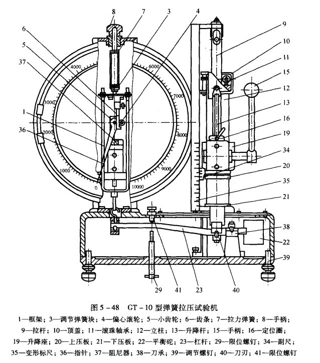 彈簧拉壓試驗機常見的一些故障介紹和排除辦法。1.(1)變換負荷時指針不對零點,超過三分格以上者。產生原因是平衡砣22位置不正常,正常使用0~200N度盤時,平衡砣由支架托著,與杠桿30分離。使用0~100N度盤時,它落在杠桿30V形槽內,并與支架脫開。(2)平衡錘28重量不合要去,加配重鉛塊失落等(3)拉力彈簧7兩端的鉤框跳出定位孔。排除方法(1)檢查位置是否正常,應酌情調整(2)應從新配上(3)將框鉤復位