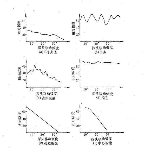 根據(jù)橫坐標(biāo)所代表的參數(shù)不同,動態(tài)波形有下列幾種形式:1.探頭所處圓周弧度大小與波幅關(guān)系的動態(tài)波形圖,這種波形圖,用直探頭探測進(jìn)行繪制,適用于軸類零件。下圖所示為軸類鍛件中幾種缺陷的動態(tài)波形圖。