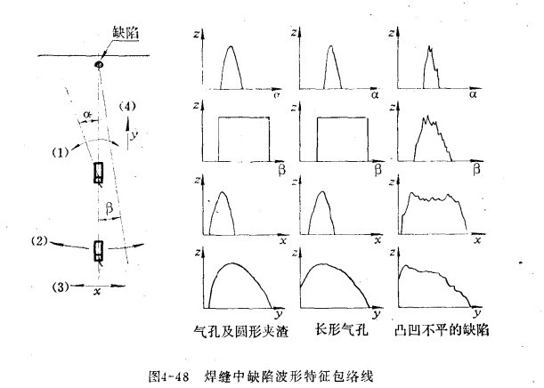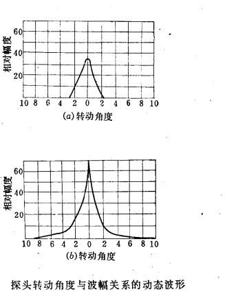 3.探頭轉(zhuǎn)動角度與波幅關(guān)系的動態(tài)波形圖 這種波形圖 用斜探頭測繪出,適用于平面工件中具有垂直或傾斜方向缺陷的定性。下圖所示為單個點(diǎn)缺陷和線狀缺陷的動態(tài)波形圖。從圖中看出單個而較小的點(diǎn)狀缺陷,探頭稍微轉(zhuǎn)動,則缺陷波立即消失。而線狀缺陷(如裂紋),其缺陷波幅隨探頭轉(zhuǎn)動角度的增大而下降直至消失。所謂轉(zhuǎn)動角度,系指發(fā)現(xiàn)缺陷波的最大值處為零,再將斜探頭轉(zhuǎn)動至缺陷波消失,則波束中心線與缺陷波最大值時的夾角。