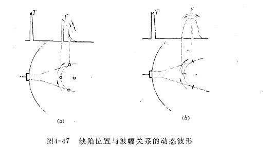 4.缺陷波位置與波幅關(guān)系的動態(tài)波形圖 這種波形圖用超聲波探傷儀直探頭測繪,適用于游動訊號缺陷的定性。下圖所示為徑向裂紋和立體形缺陷的波形圖。