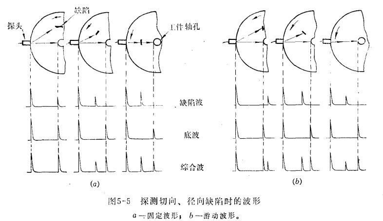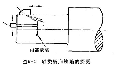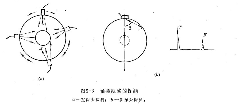 三、大型鍛件的探傷 (1)軸類鍛件的探傷 軸類鍛件如發(fā)動(dòng)機(jī)主軸,汽輪機(jī)及發(fā)電機(jī)的轉(zhuǎn)子軸以及柴油機(jī)曲軸等,在運(yùn)轉(zhuǎn)時(shí),轉(zhuǎn)速很高,承受中、高載荷,為了保證軸類鍛件能正常工作,必須使用超聲波探傷儀探測(cè)其缺陷。探測(cè)方法一般用脈沖發(fā)射法,頻率通常用2.5兆赫。用直探頭在軸的周圍上探測(cè)時(shí),利用直探頭的中心聲束來發(fā)現(xiàn)與軸徑向中心線垂直或接近垂直的缺陷,并依靠探頭的擴(kuò)散聲束來發(fā)現(xiàn)與軸徑向中心線平行或接近平行的缺陷,如下圖所示a,用斜探頭沿軸的圓周方向探測(cè)時(shí),可有效的發(fā)現(xiàn)徑向缺陷,特別是近于軸表面的裂紋,如圖b所示。橫向缺陷,可用直探頭在軸的兩端探測(cè),但有的缺陷處于圓角近表面或缺陷較小距離又遠(yuǎn),而用直探頭探測(cè)難以發(fā)現(xiàn)時(shí),可用斜探頭沿軸的長(zhǎng)度方向探測(cè),如圖2。
