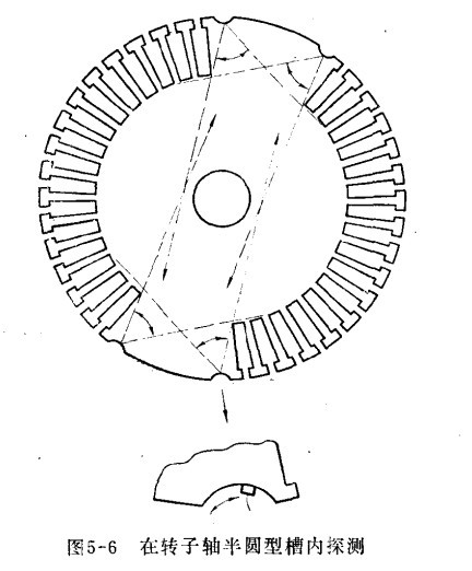 對(duì)安裝完畢的電機(jī)轉(zhuǎn)子軸而言,因形狀復(fù)雜,若用通用的方法探測(cè),則使探測(cè)范圍受到限制,有些區(qū)域內(nèi)的缺陷不能發(fā)現(xiàn),因而可在電機(jī)轉(zhuǎn)子的大齒面上開四個(gè)半圓形的槽,將具有相應(yīng)曲率的探頭放在此槽內(nèi)擺動(dòng),使聲束能掃查到所有截面,這樣,能探測(cè)到大部分區(qū)域,如下圖。