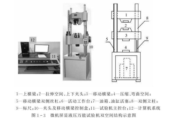 1—上橫梁;2—拉伸空間、上下夾頭;3—移動橫梁;4—壓縮、彎曲空間;