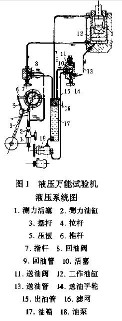 如圖1,郵箱17內的油液經過濾油器被吸入油泵18,再經油泵的出油管15送到油閥11內,當送油閥11的送油手輪14關閉時,由于油壓作用將送油閥門內活塞9流回油箱,當送油手輪打開時,則油液經送油管13至工作郵箱12內,活塞上移,對試件加載。