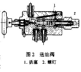 (2)送油閥內有雜質。當不干凈的東西如鐵沫、油渣等隨油帶到送油閥(如圖二)的內部時,易使活塞受損,同時對指針平穩上升亦有影響,要取出這些不清潔的東西,可擰下螺釘2用小絲桿從后面擰在活塞1上把它拉出來,用油清洗閥體內孔、活塞,然后重新裝上活塞及螺釘2,裝螺釘2時質疑內部必須灌油再擰上,使內部不存有空氣,否則會影響油閥正常使用。