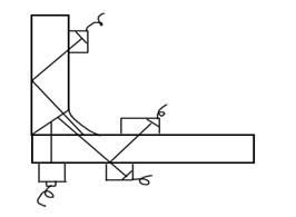 圖 2 ,角焊縫。綜合使用斜探頭、直探頭,多面、多次探測。