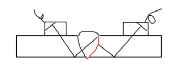 圖 1 ,對接焊,焊縫余高未磨平、只能單面探測。可使用斜探頭、觀察一次或二次回波,在焊縫兩側(cè)進行掃查探傷。