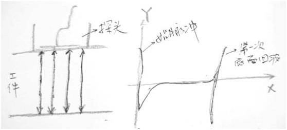 備注:t0點是發射的起始時間點(始脈沖),t1點是第一次底面反射回波被接收到的時間點。兩者 的時間差乘以聲速,再除以2,就是超聲波在工件一個單程傳遞的路程,即厚度值。